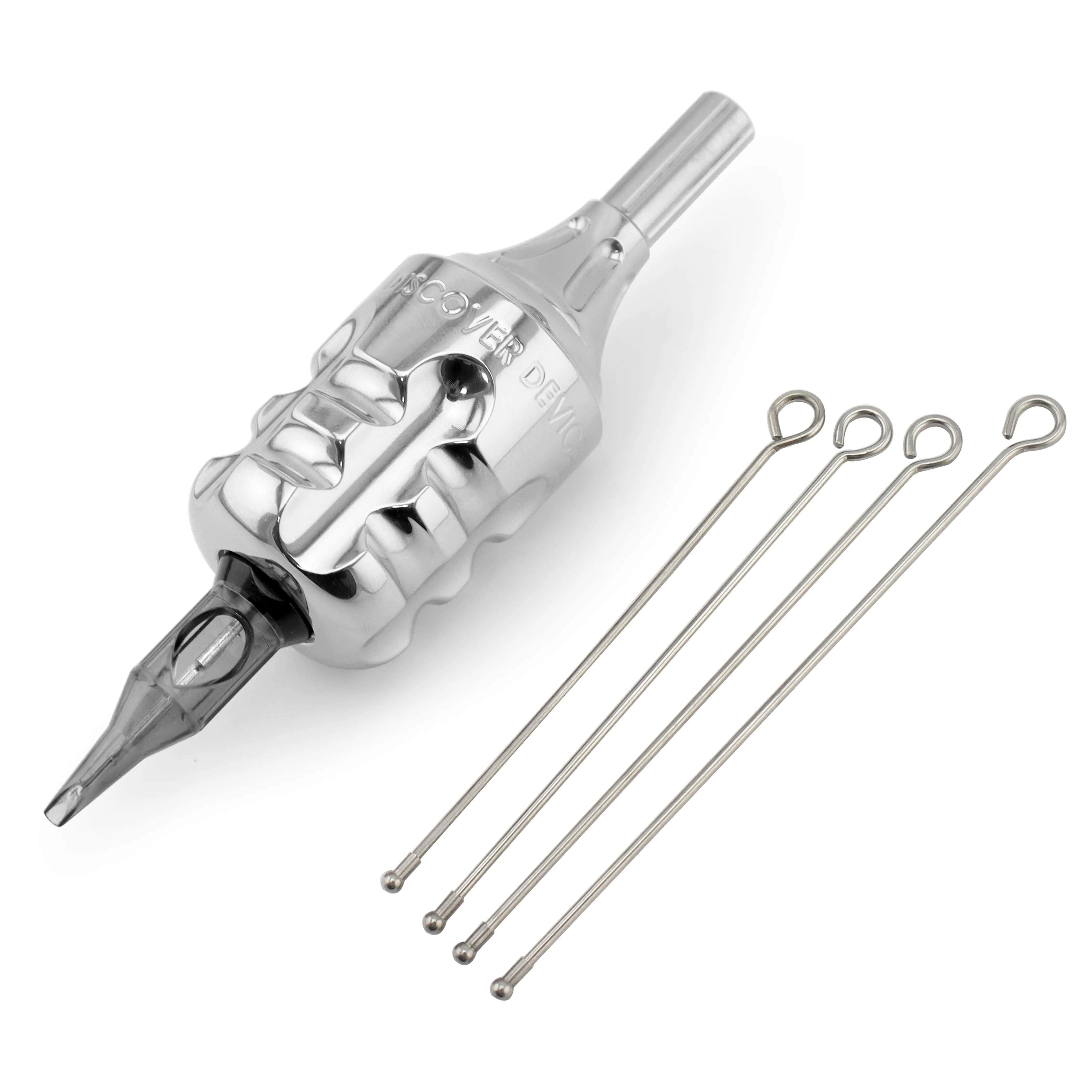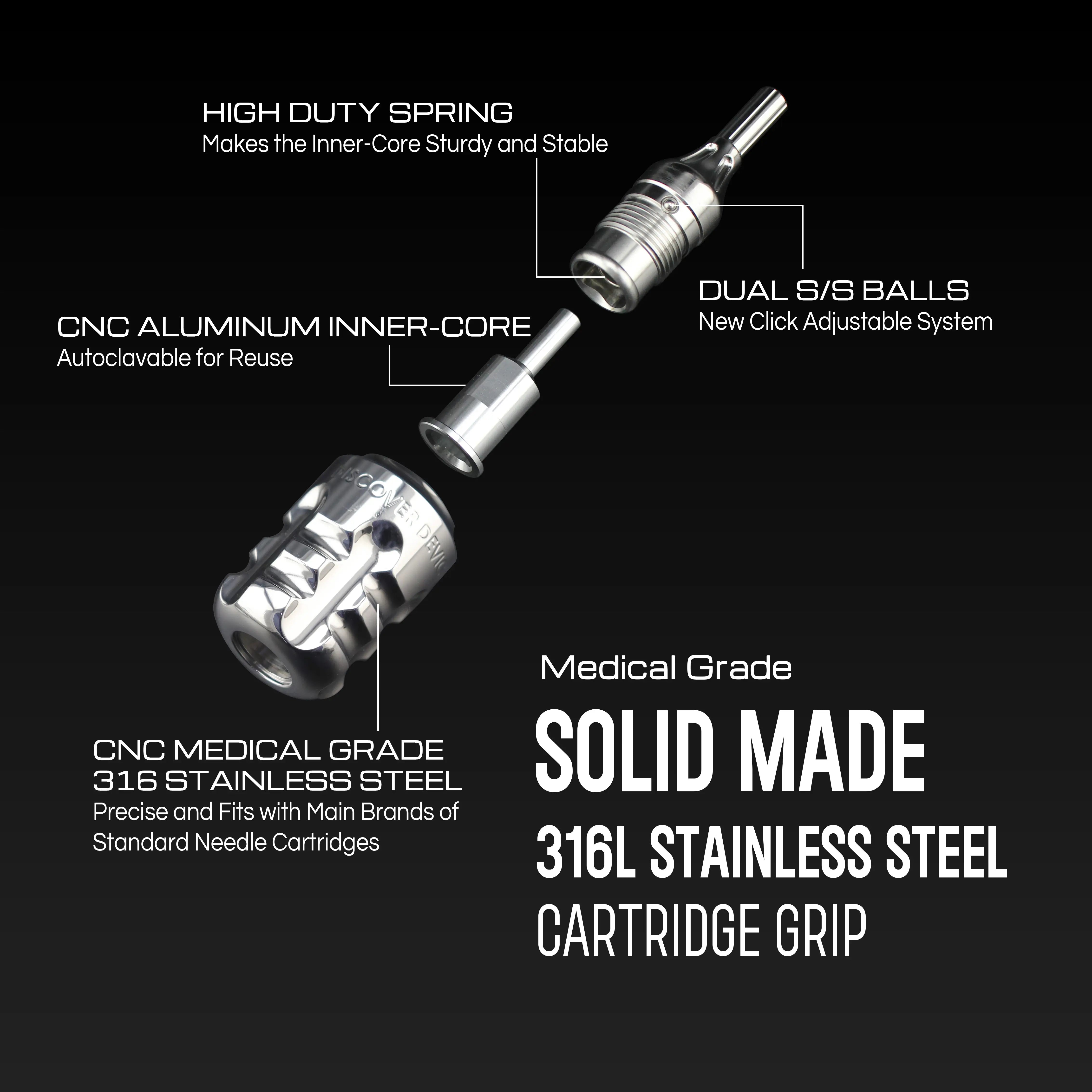 • Made from medical stainless steel and CNC aluminum inner core with dual stainless steel click balls,※This stainless steel tattoo cartridge grip is only fit for rotary tattoo gun and coil machine, not for pen type tattoo machine.